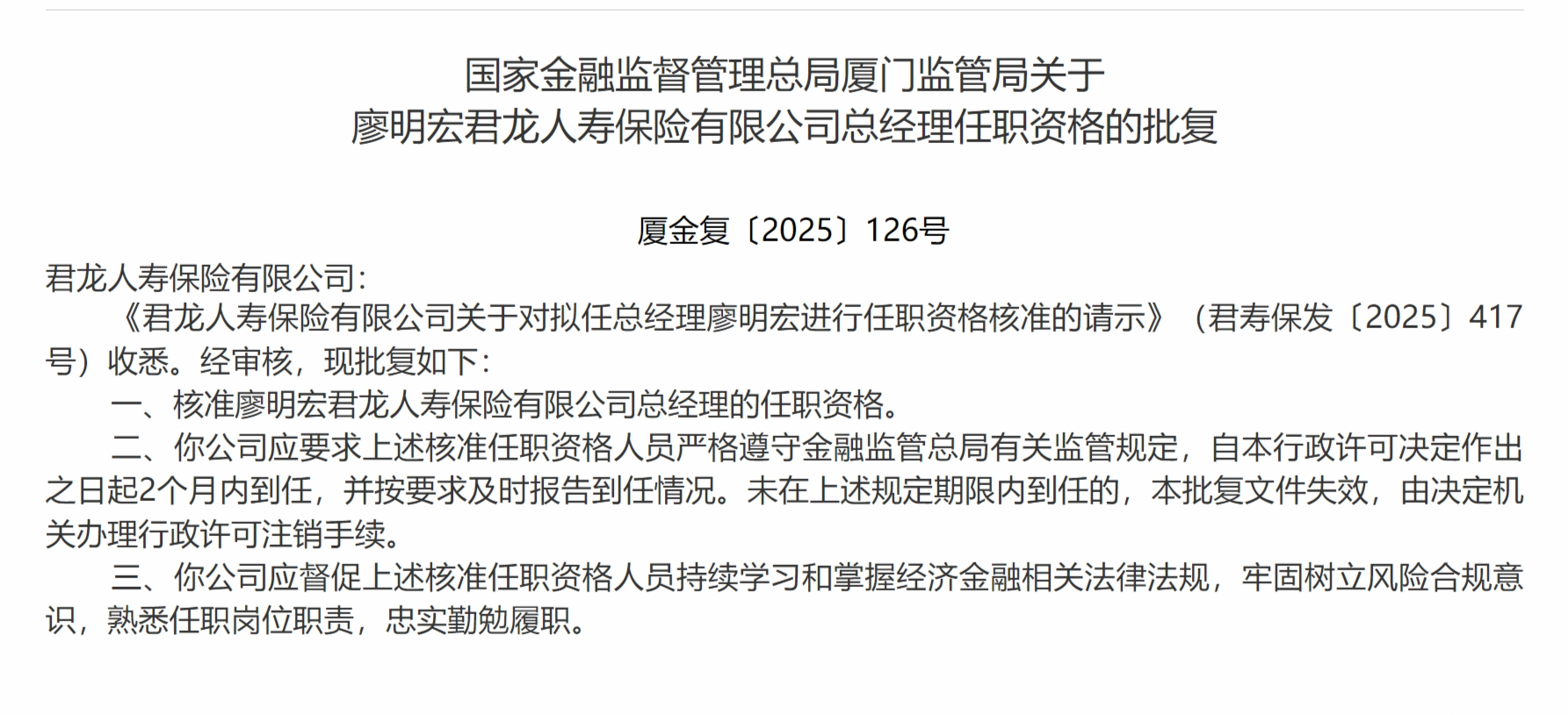 12月16日,国家金融监督管理总局厦门监管局发布关于廖明宏君龙人寿保险有限公司总经理任职资格的批复,核准廖明宏君龙人寿保险有限公司总经理的任职资格。